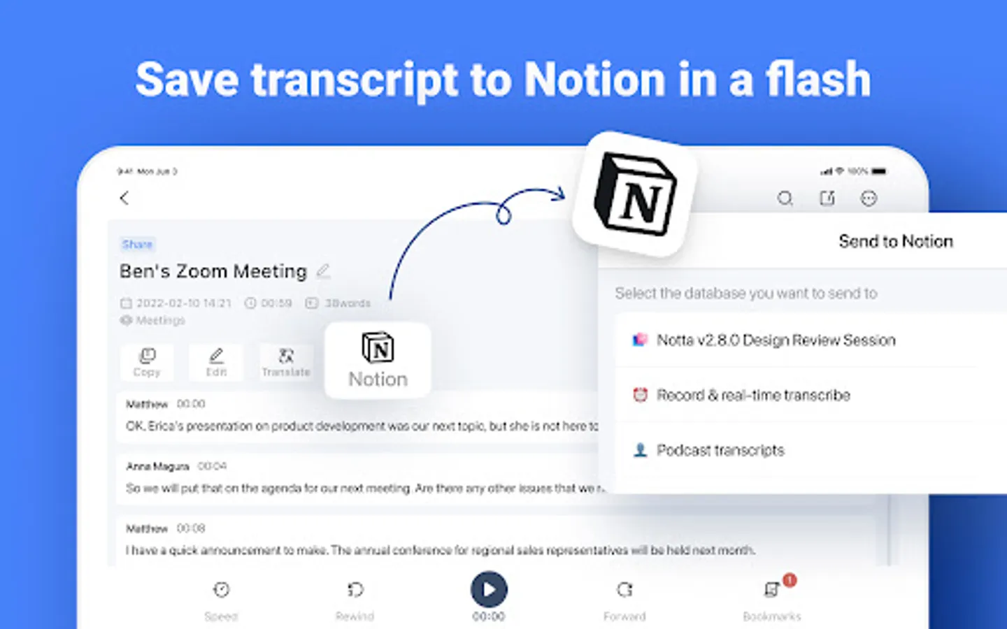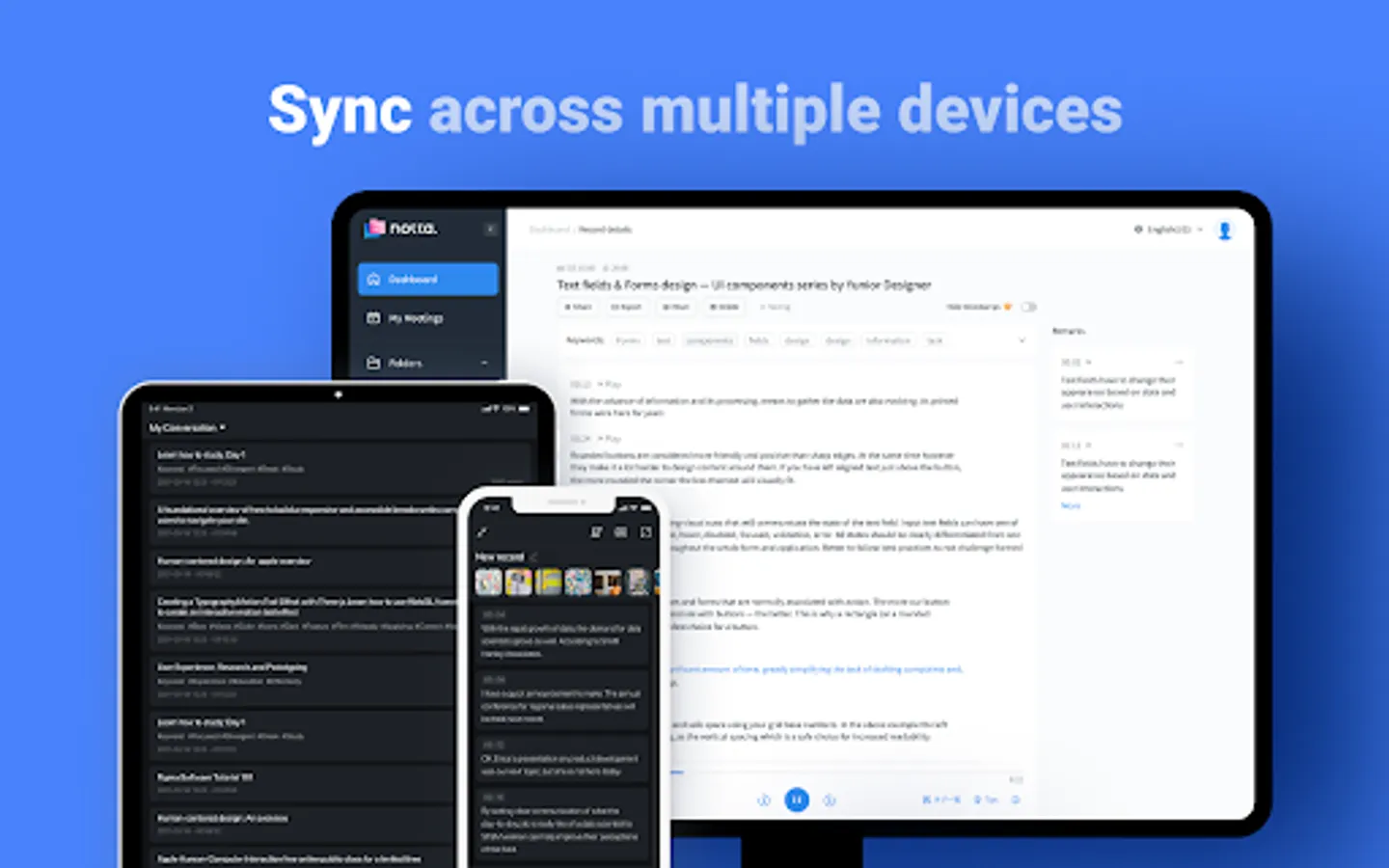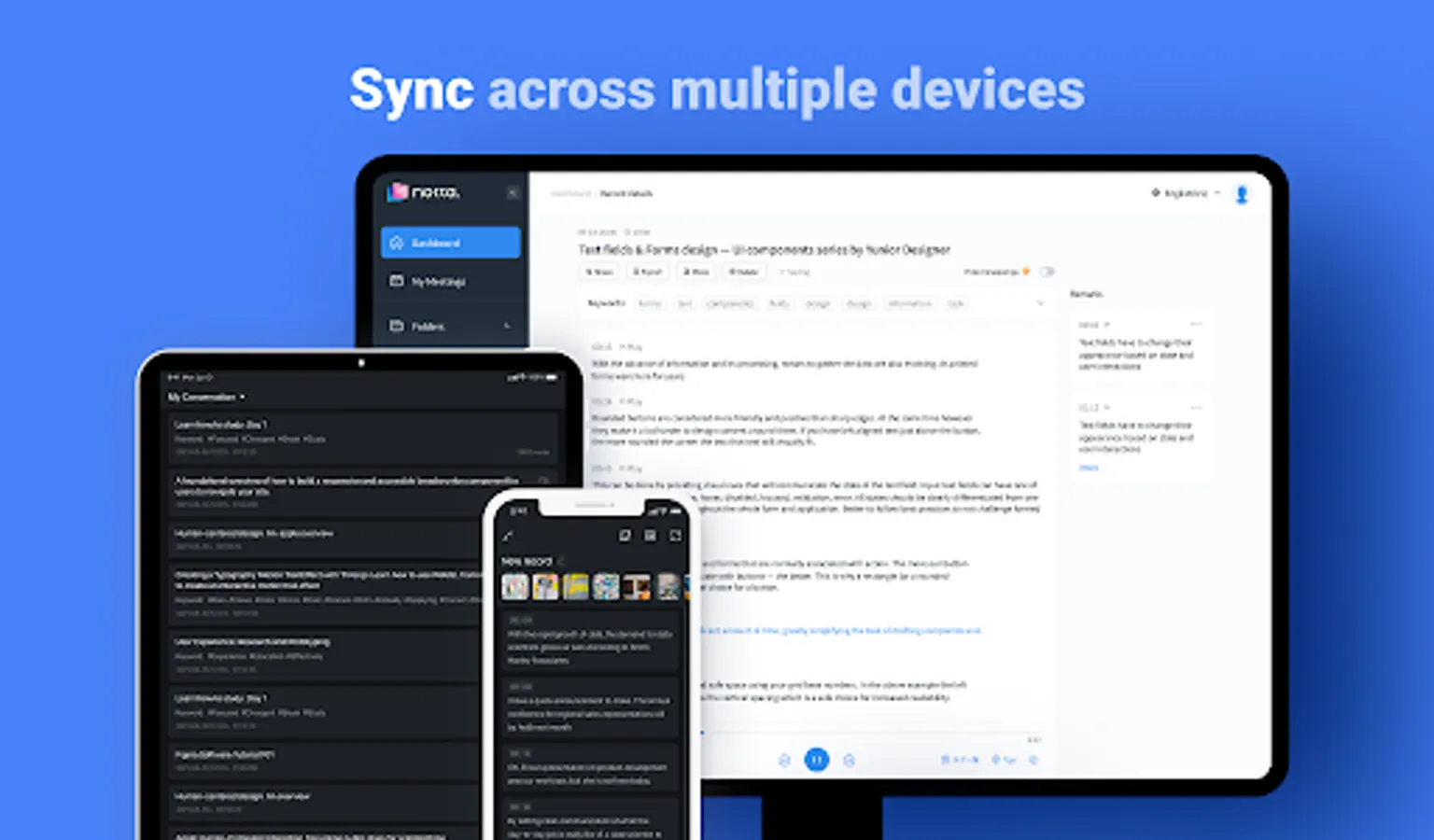 Every conversation, including audio and transcript, will be synced across your devices. For example, you can record conversations on your phone, playback recordings on Notta Web(https://www.notta.ai/en), and then edit transcripts on your PC, Mac, or iPad.