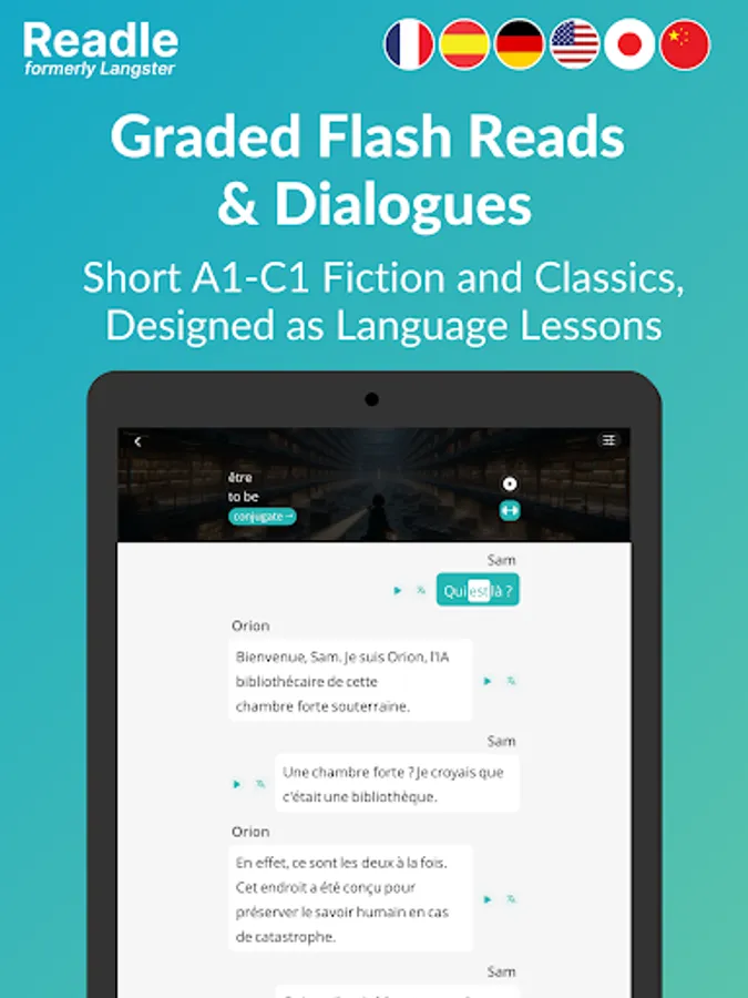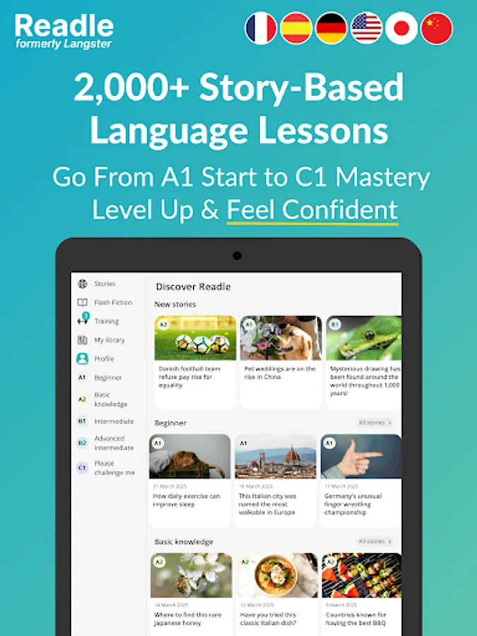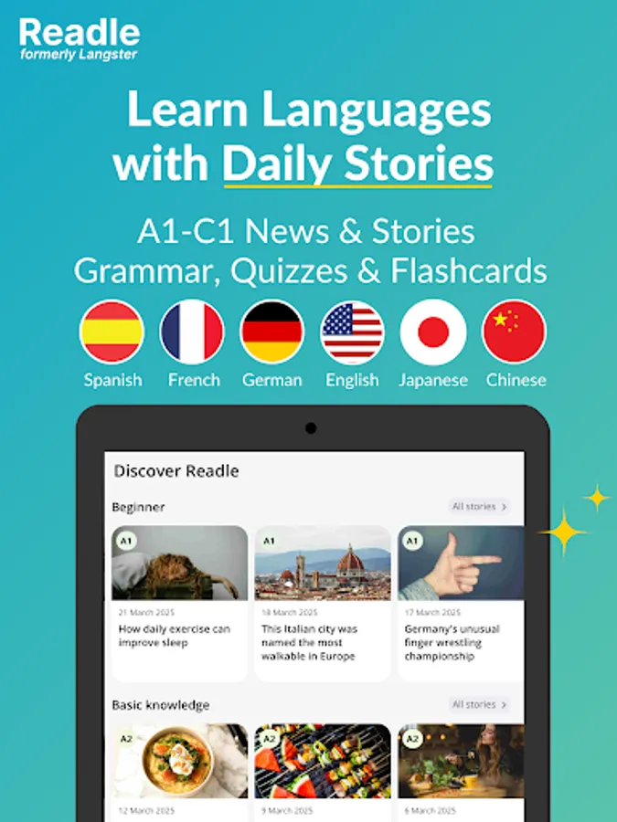 Learn languages faster with over 2,000 real-world news stories, transformed into bite-sized lessons and smart flashcards that make learning quick and effective. Readle (formerly Langster) is the world’s first CEFR-levelled reader designed to help you learn Spanish 🇪🇸🇲🇽 , German 🇩🇪, French 🇫🇷, English 🇬🇧🇺🇸, Japanese 🇯🇵, and Chinese 🇨🇳 in real-world contexts. Just 5 minutes a day is all it takes to start learning smarter — and faster.