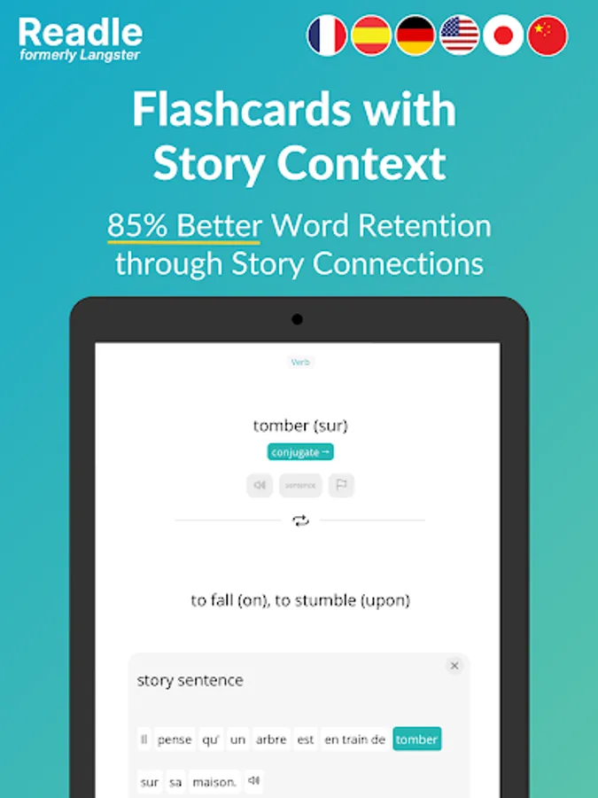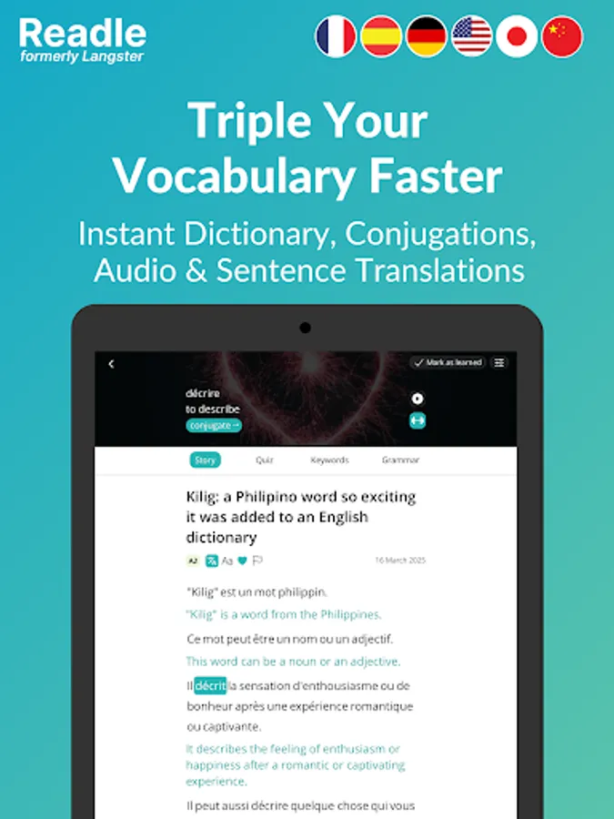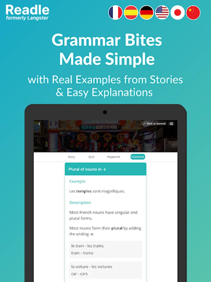 +2000 interesting stories & news for learning languages: Whether you want to learn English, French, German, Spanish, or Japanese, Readle (formerly Langster) allows you to learn in context, including grammar tips and vocabulary flashcard training.