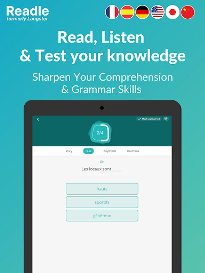 • Readle is your companion for reading, listening, comprehension & flashcard vocabulary training with thousands of stories.