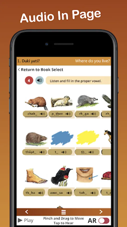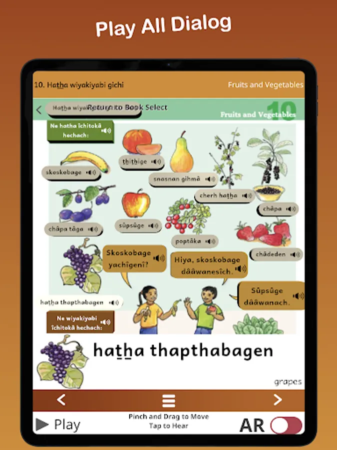 The Stoney Nakoda Media Player is a companion to the Stoney Nakoda Textbooks. Just point your phone at the page and tap to hear Native speakers pronounce the words. The AR and Page Modes gives you complete access to the textbook vocabulary and audio with an easy tap and swipe interface.