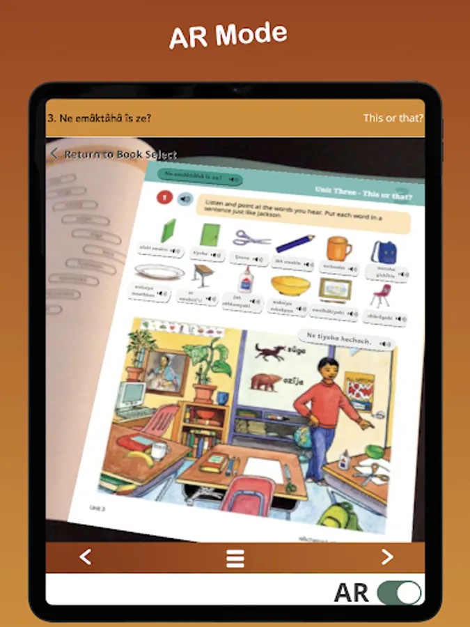 The Stoney Nakoda Media Player is easy to use. You’ll start out in Books, where you can select your book. Tap the book again to enter Page Mode. If you are asked to allow camera use, press agree or yes if you wish to use AR Mode. Tap AR Mode Switch to switch the camera on. Tap Play to start auto-playback. Tap right or left arrows to proceed to the next or previous Section. Tap the hamburger button to select the section from a list.