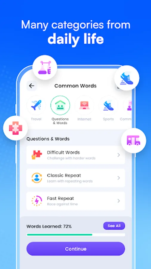Lay the groundwork by familiarizing yourself with a vast collection of common words. From verbs to nouns, grasp the essentials that will pave your way in any dialogue with Memorize - English Learning app.