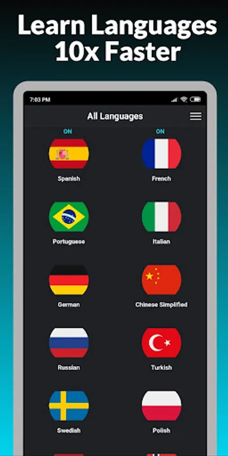 Learn Spanish, French, German, Italian, Russian, Portuguese, Chinese, Japanese, Korean, Turkish, Dutch, Danish, Swedish, Polish, Norwegian, Arabic, Hindi or even English by chatting, listening and speaking.