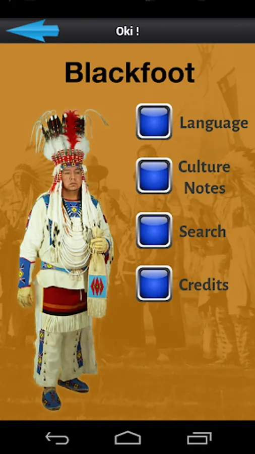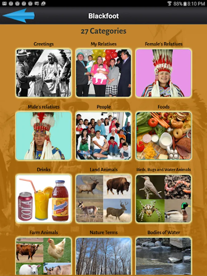 The Siksika (Blackfoot) Nation located in southern Alberta, Canada is elated to announce a “Blackfoot App” to facilitate the learning of Siksika (Blackfoot) phrases organized under 29 theme categories complete with audio, images, quizzes and games. Also included in the app is a cultural section of historical images; a short sign language video; and a variety of songs including: owl dance songs, hand game songs, lullabies and word songs to supplement the phrase categories. This work is a collaboration between the local tribal college, Old Sun Community College and the Siksika Board of Education.
