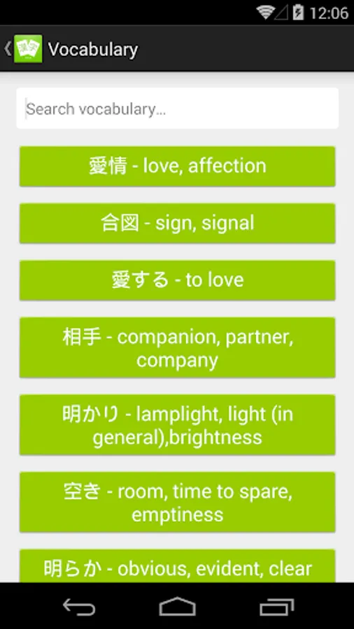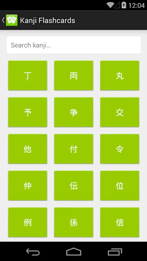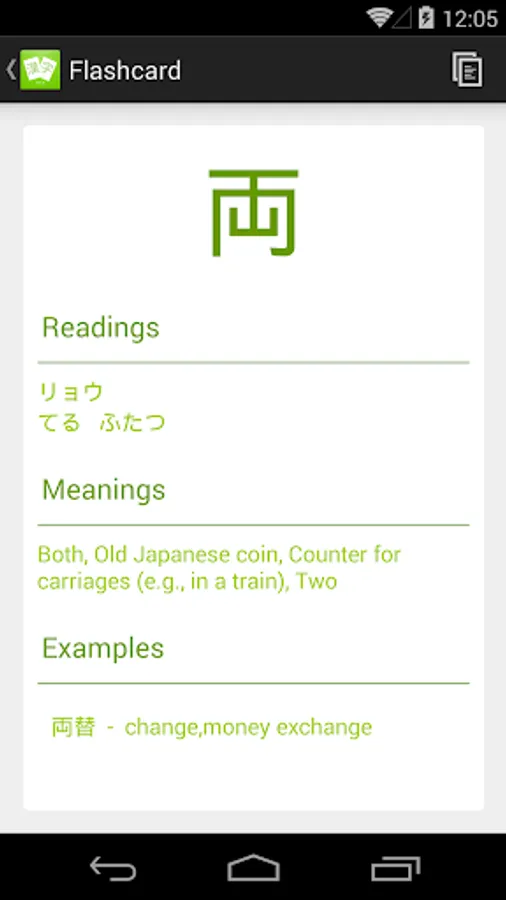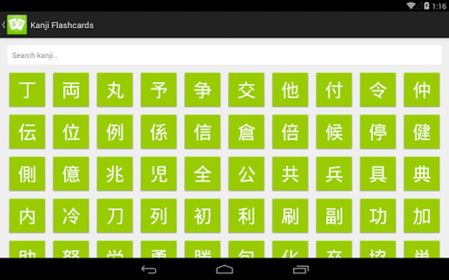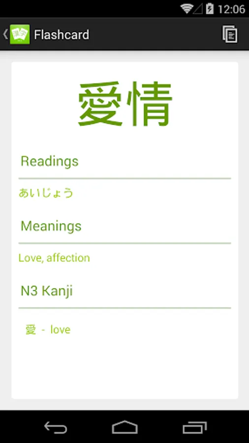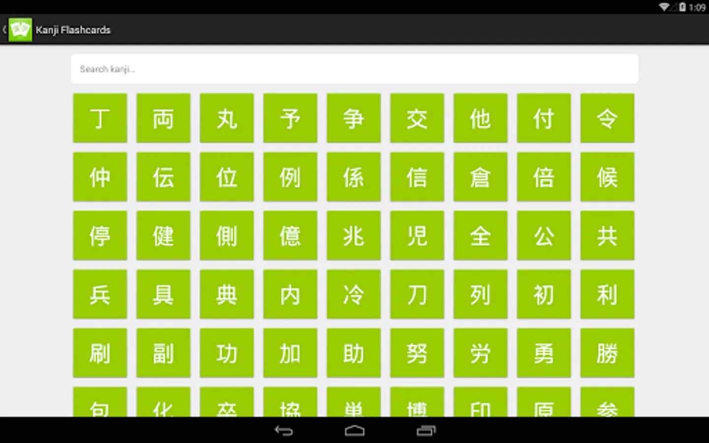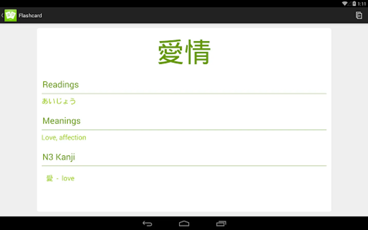 • Searchable flashcards for over 360 JLPT N3 Kanji; including readings, meanings and example words and compounds.