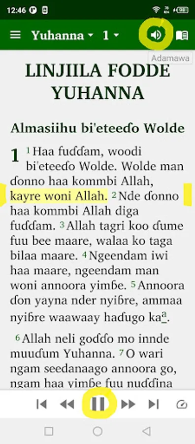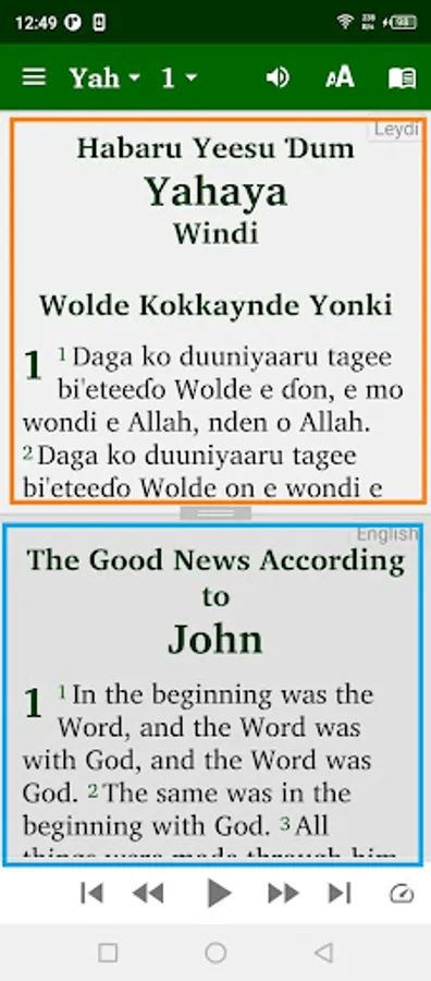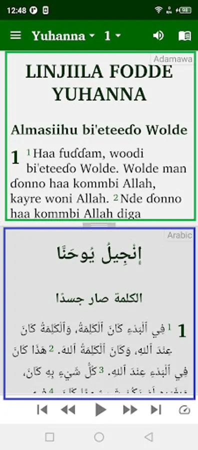 - “verse by verse” to display a verse in Fulfulde followed by the same verse in French or in English or in Arabic.