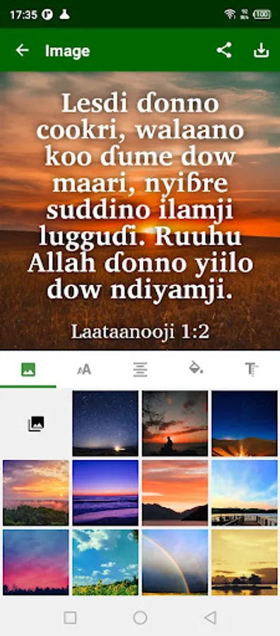 • When you tap on a verse, an image button is displayed on the bottom toolbar. When this button is pressed, the screen appears. You can choose the background image, move the text around the image, change the font, text size, alignment, format and color. the final image can be saved on the device and shared with others.
