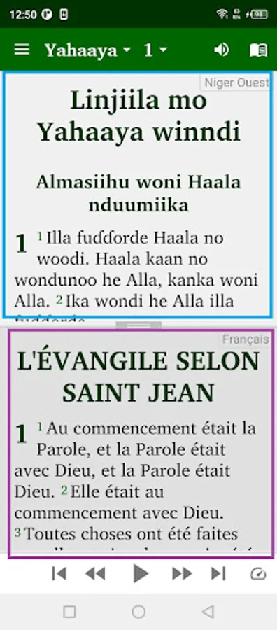 - "two panes" to display the Fulfulde at the top and in parallel the French or English or Arabic version at the bottom