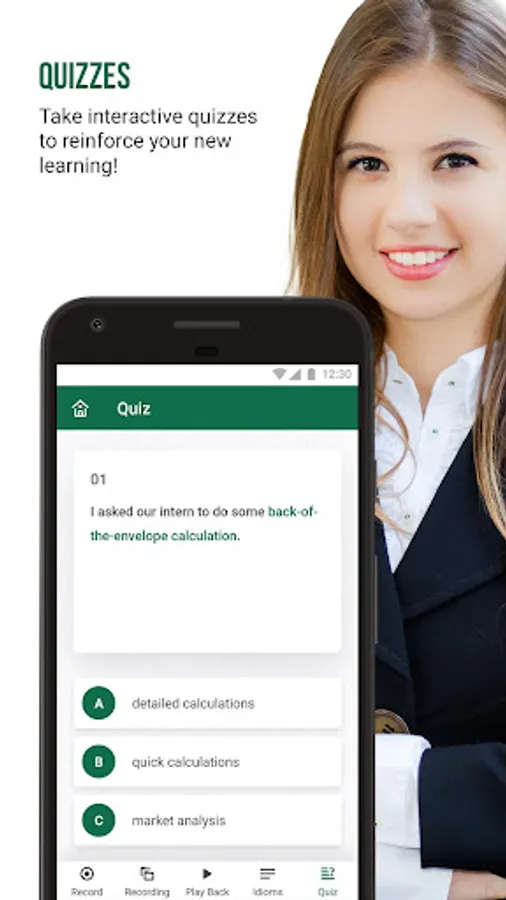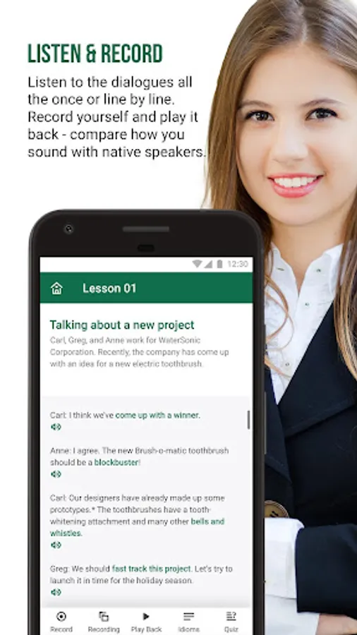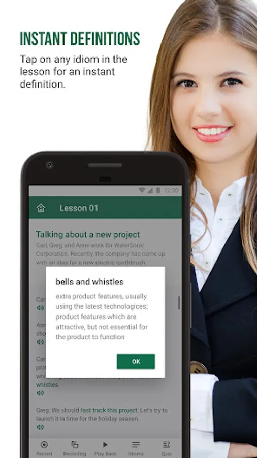 Speak Business English quickly and confidently! This app will teach you the idioms and expressions you hear at work. Once you learn them, you will understand native speakers better and your English will sound more fluent.