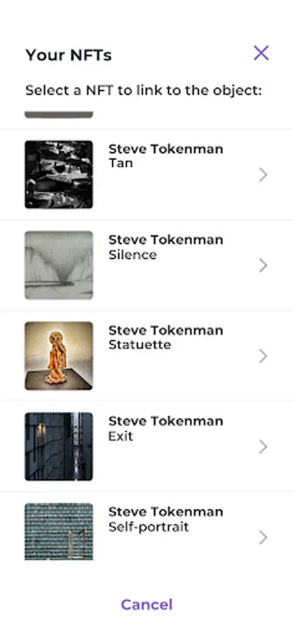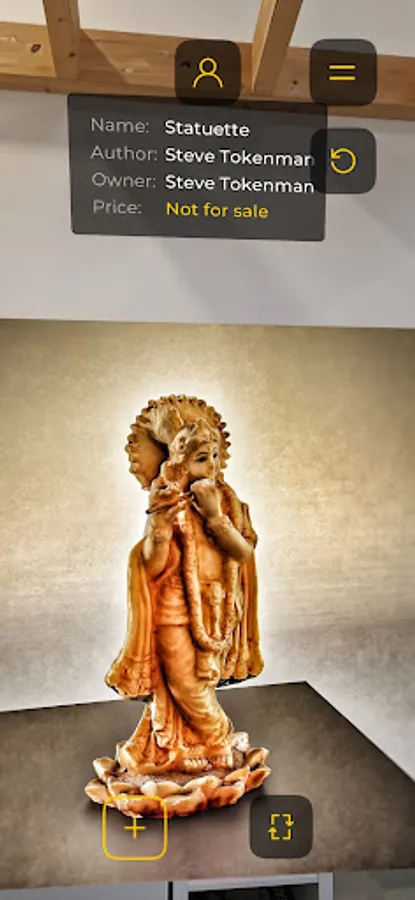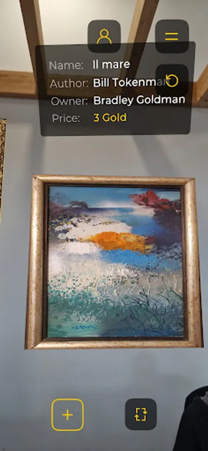 Each item of the content placed into the system as non-commercial NFT to provide the security of IP. The end user once opened the app and focused the camera of the smartphone on the walls of the space, can view the works placed by an artist in AR with the following info next to each item: