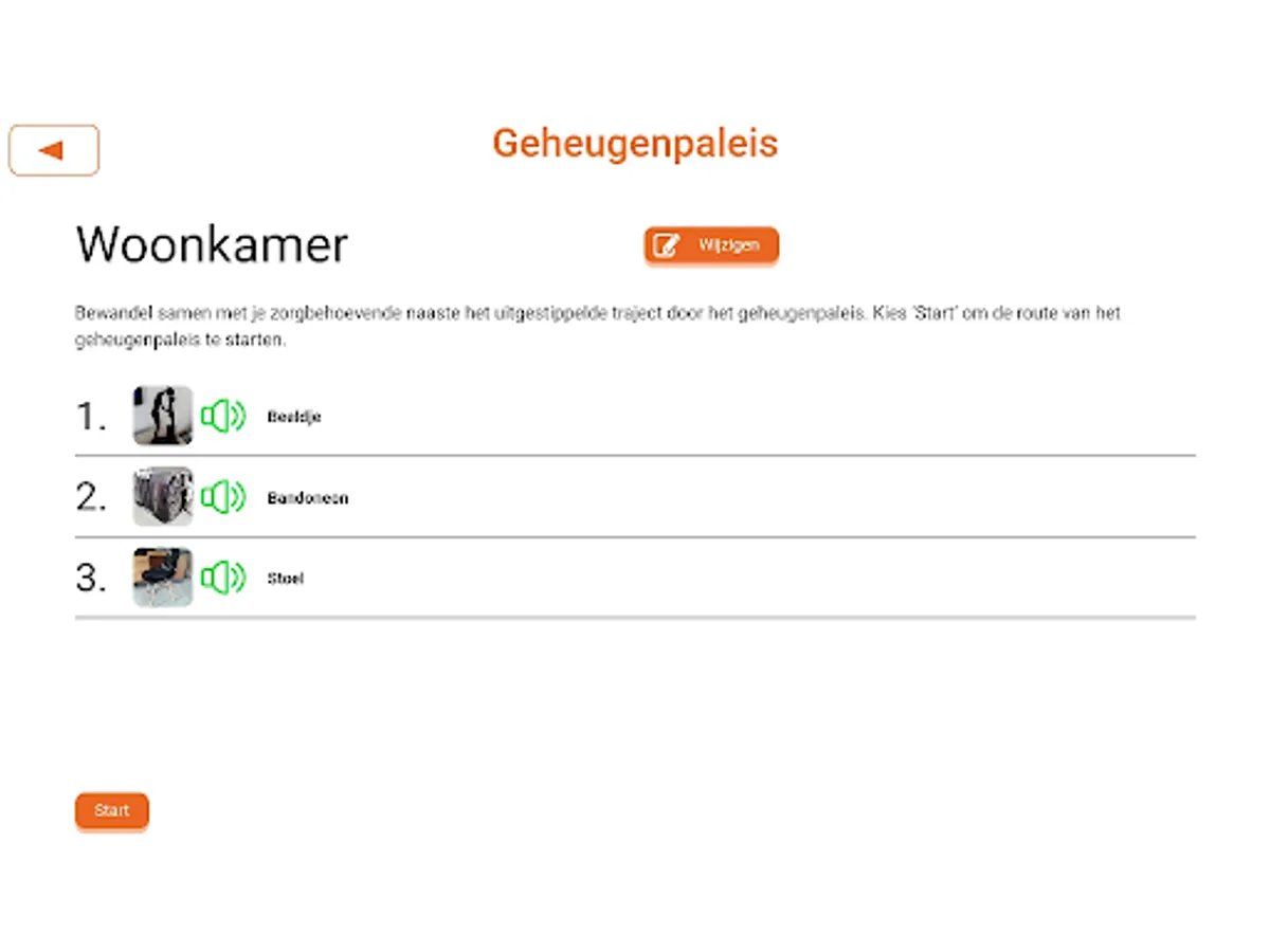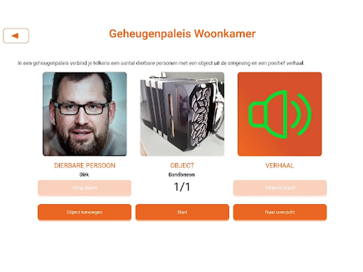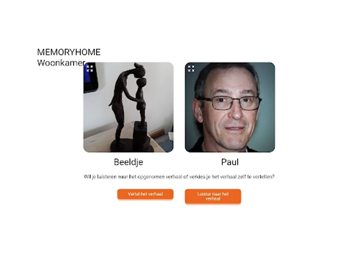 Using the MemoryHome app you can take people who are coping with Alzheimer’s or dementia on a walk through their familiar environment (their house, their nursing home etc.). While walking you invite them to tell positive stories about their loved ones, as you pass fixed objects on your trajectory to which these cherished persons are linked. The mobile app supports this process in a simple manner.