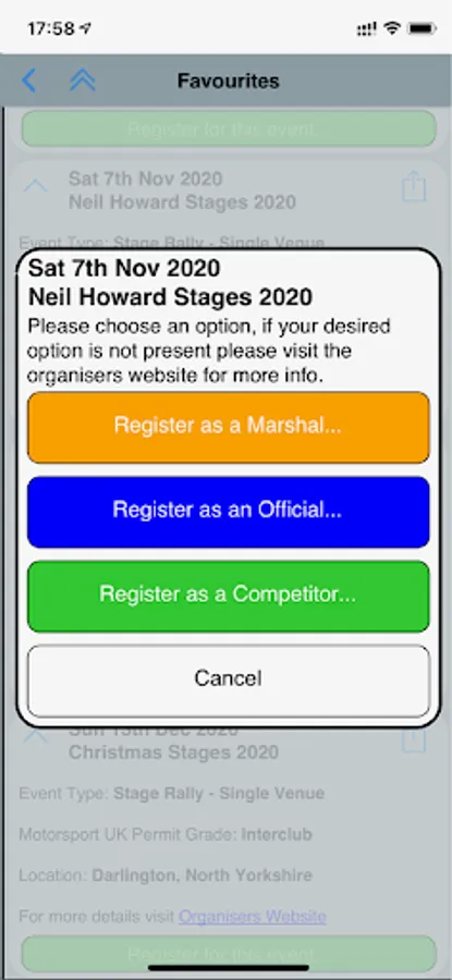 The APP will list selected events along with dates, rough location, event type and grade, along with links to organisers websites and any relevant documents.