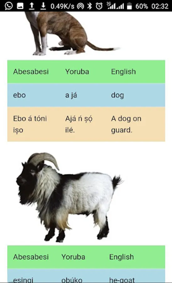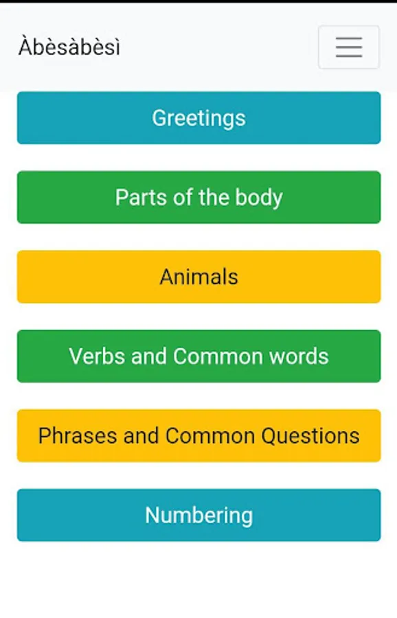 The app is divided into sections for easy navigation, and each word is translated into english and yoruba languages and a sentence/phrase is constructed with each word.