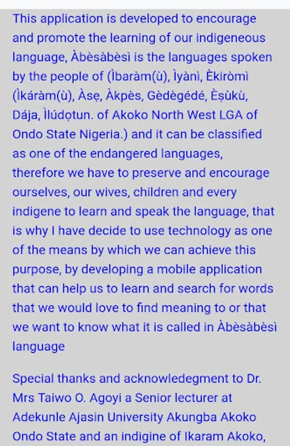 This application is developed to encourage and promote the learning of our indigeneous language, Àbèsàbèsì is the languages spoken by the people of (Ìbaràm(ù), Ìyànì, Èkiròmì (Ìkáràm(ù), Àsẹ, Àkpès, Gèdègédé, Èṣùkù, Dája, Ìlúdọtun. of Akoko North West LGA of Ondo State Nigeria.)