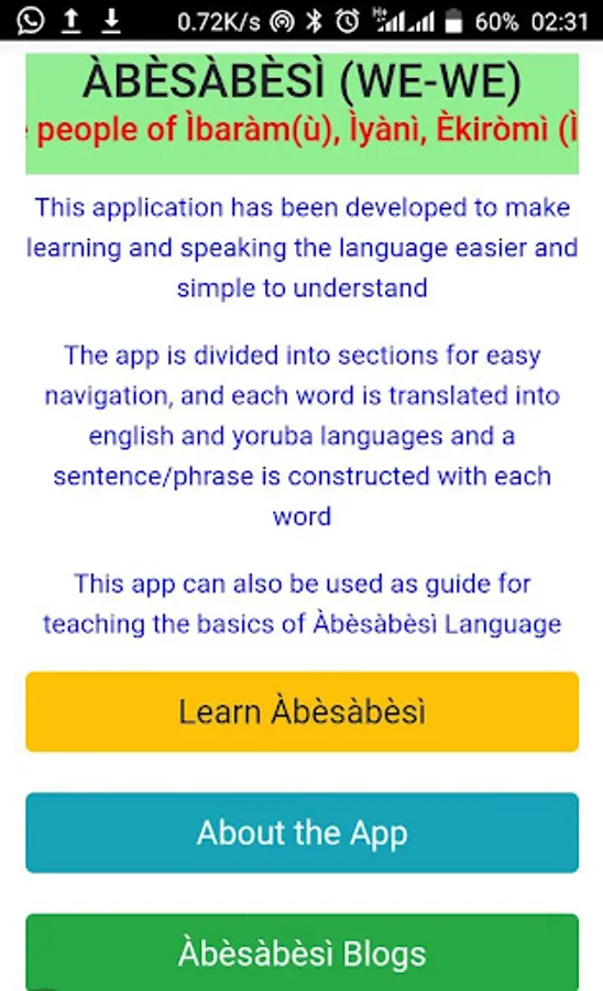The app includes blogs section with several intersting contents. We are already working on producing a version with audio pronounciation and more contents. This app can also be used as guide for teaching the basics of Àbèsàbèsì Language