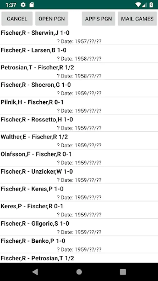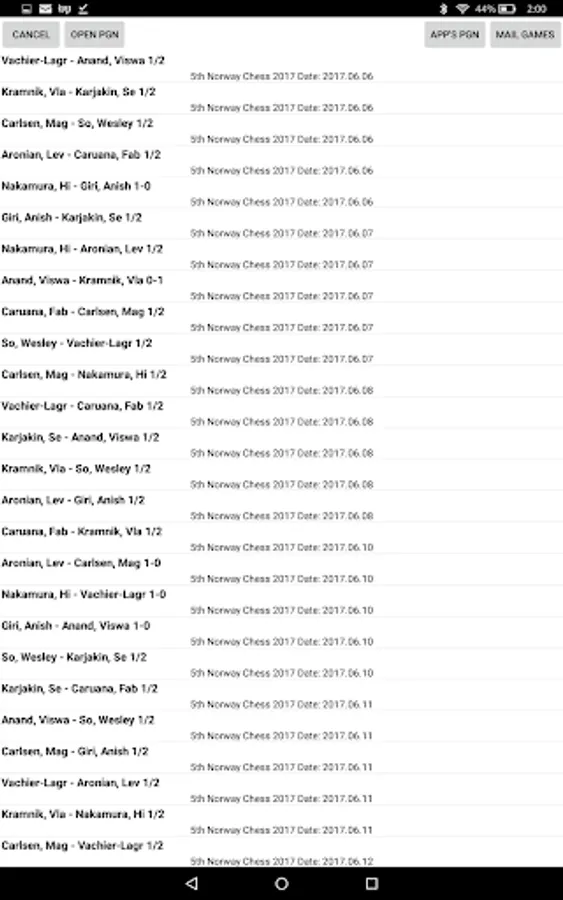 In the Actions menu PGN game files can be opened. OpeningTree asks for the permission to access device storage for the purpose that when the user goes to Open PGN our file chooser will work. The app also comes with some installed PGN files on Open App's PGN menu item. To ensure speed in loading, it will only read/load a max of 2500 games. With bigger files users will only see first 2500. The menu option to open the apps PGN vs open any PGN will work with no special permissions.