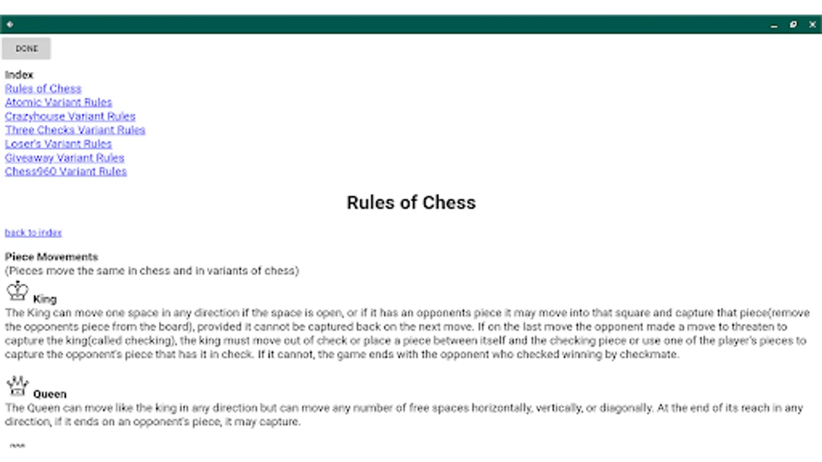 On game / new game if play vs the computer is unchecked the user can play in two person mode which I've found useful when I have a device and want to play a chess game but no chess board with another person who is present.