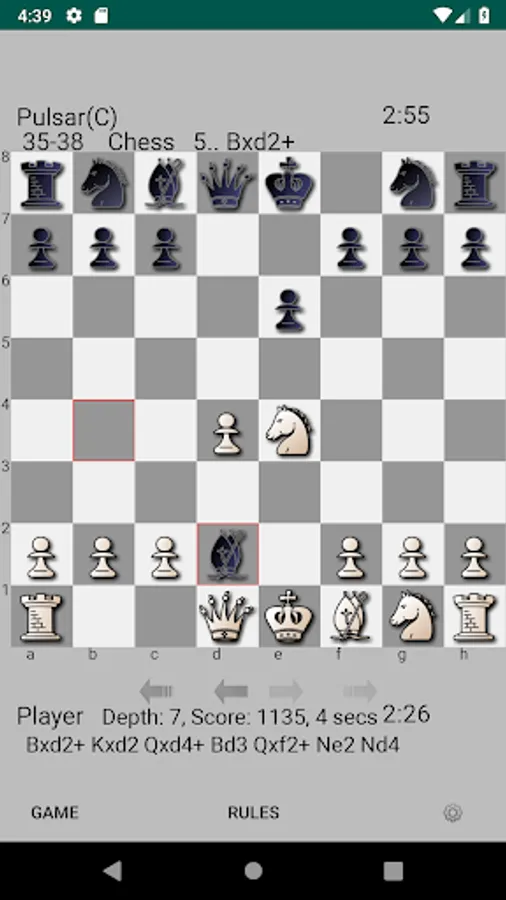The Pulsar Engine plays Chess, with levels, and six variants. Its most played option is still chess. Works on and offline. I originally developed Pulsar as a Winboard engine/computer program starting in 1998, and between 2002-2009 taught it to play the variants it knows. It was released on mobile for the first time in 2014 and on Android in 2019. The variants are Chess960, Crazyhouse, Atomic, Loser's, Giveaway(also known as Suicide – goal is to lose your pieces) and Three Checks. IIt values mobility and open play more than closed positions. At variants, each has its own style.