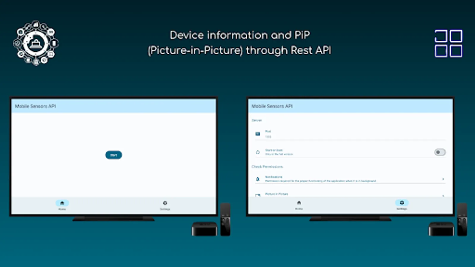 Use 'Mobile Sensors API' to transform your Android devices (smartphone, tablet, TV) into IoT devices using RestAPI. You will be able to retrieve information from your devices and remotely control them within your WiFi network.