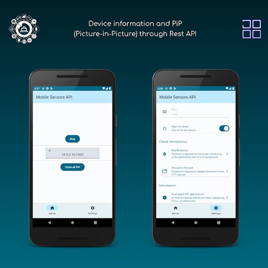 The application will require notification permission. This is used to persist the service that receives HTTP requests. If you intend to use the Picture-in-Picture (PiP) methods, grant the permission from the 'Show over other apps' settings of the application.