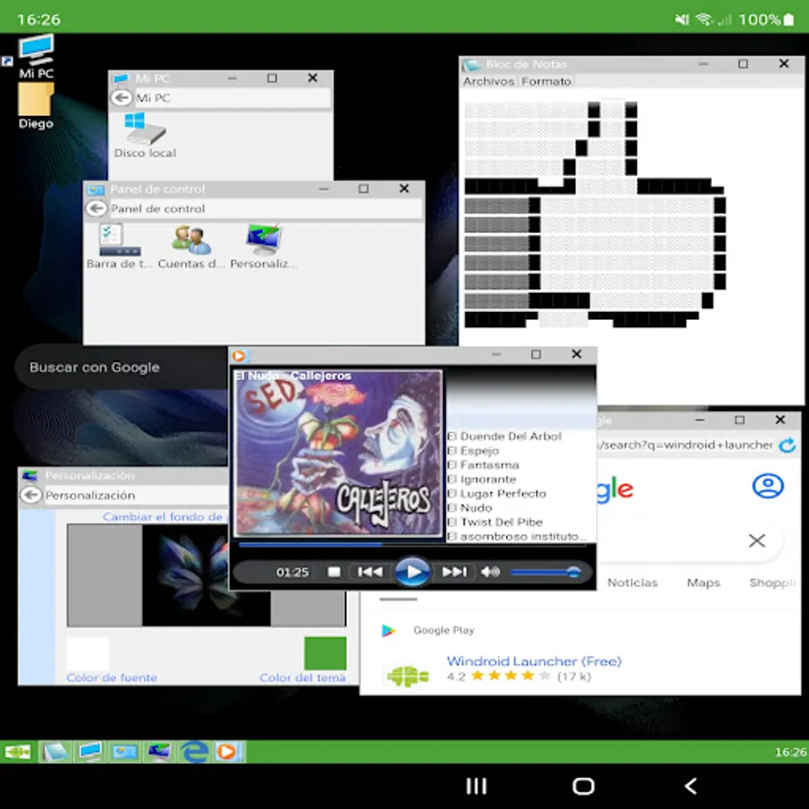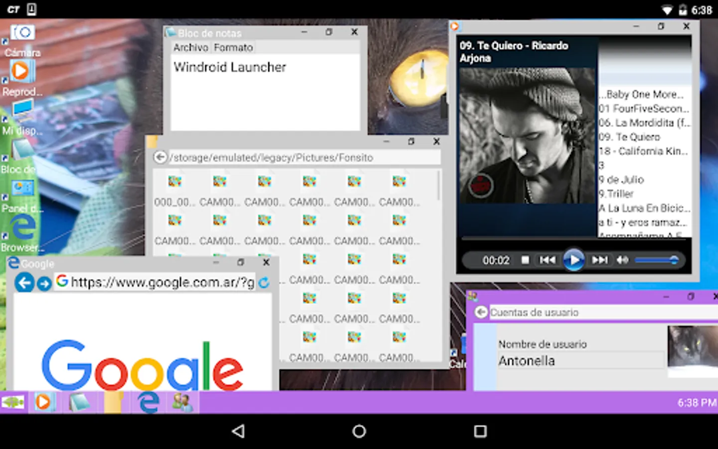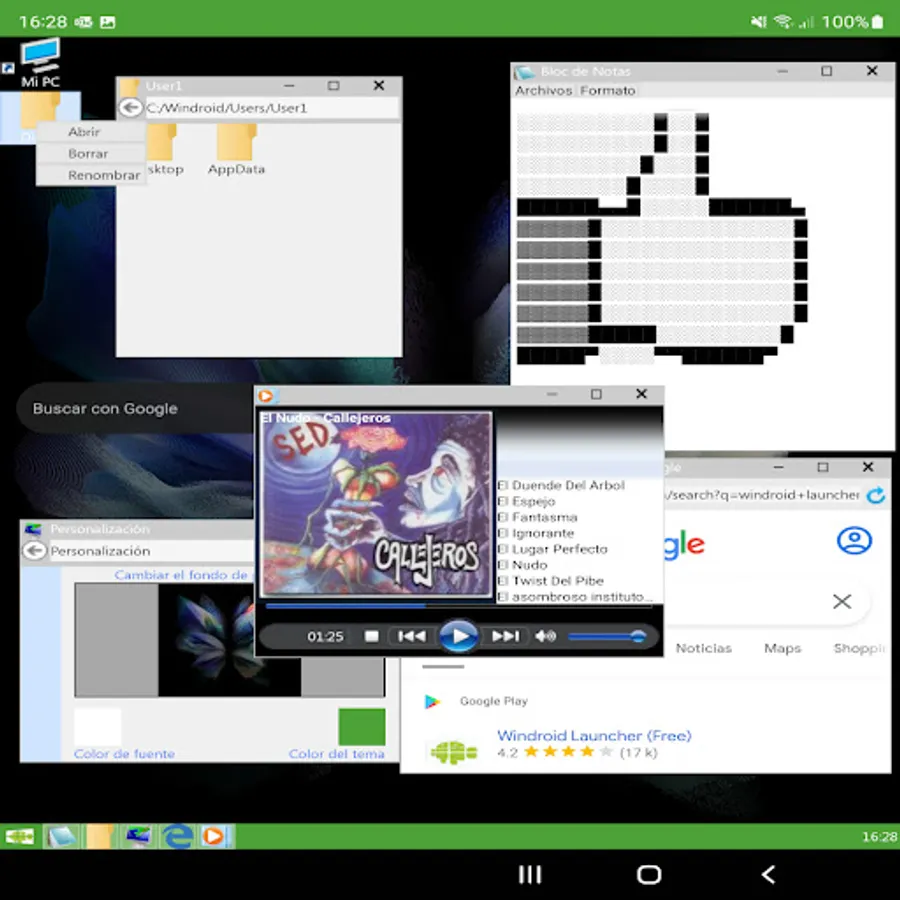 *Para agregar un icono al escritorio, abrir la barra de Windroid, mantener presionado el icono en cuestión unos segundos y luego arrastrar el icono al escritorio.