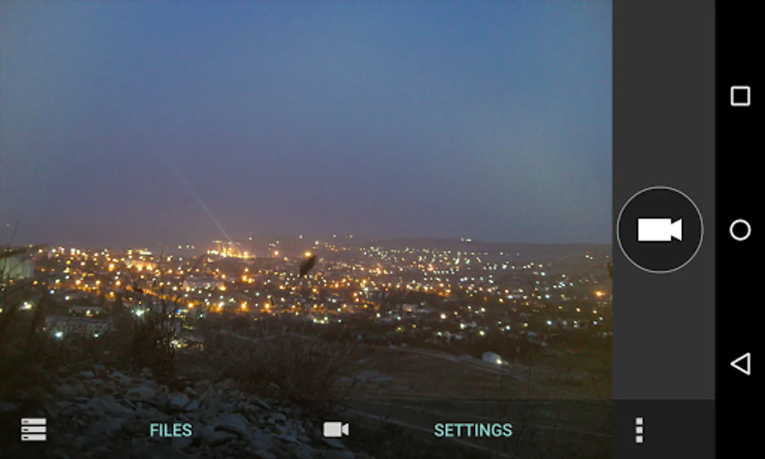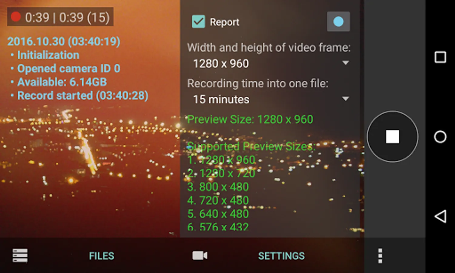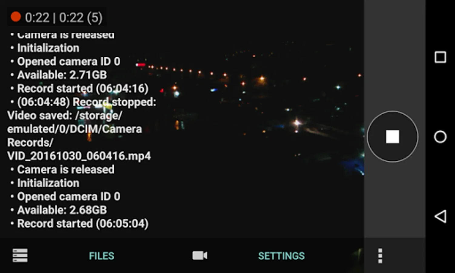 The application is designed to capture video from device camera in the files by specified time interval. In the application settings you must choose the size of the video frame when capturing and recording time into one .mp4 file (from 5 to 30 minutes). During the recording the device screen will be turned on permanently.