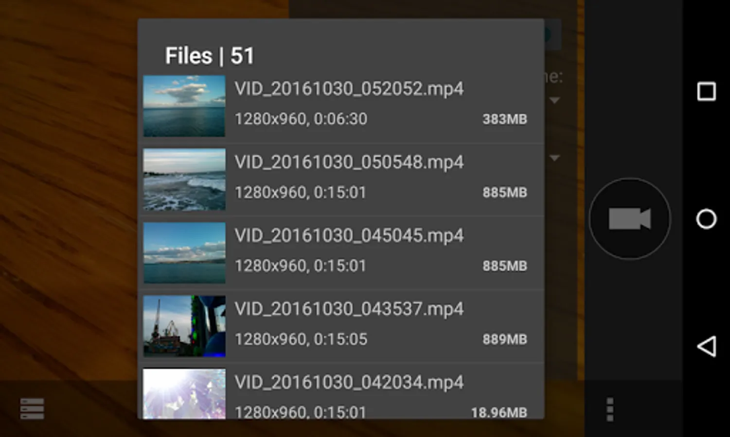 Implemented display of the report and viewing a list of saved video files that are stored in the directory "/sdcard/DCIM/Camera Records" of the primary external storage. By clicking on the list item be selected application (from installed on your device) to playback of the selected file.