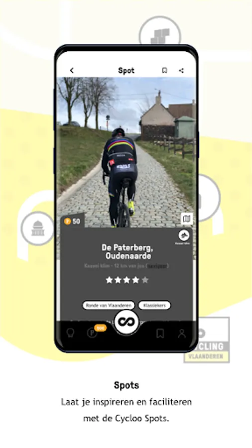 Looking for nice slopes or cobblestone strips? Or urgently looking for a coffee or a toilet? Be inspired and facilitated with the Cycloo Spots!