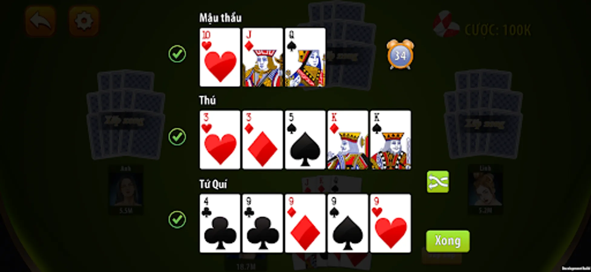 Mau Binh, or Binh Xay, is one of the most popular games in the intellectual and artistic card game genres. Each player will be dealt 13 cards and think logically into 3 limbs including the first and middle and last limbs so that the front limb is stronger than the hind limb. The arrangement of 3 limbs into a strong and harmonious hand position to win against the opponent is not simple requiring logical thinking and playing experience.