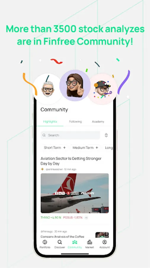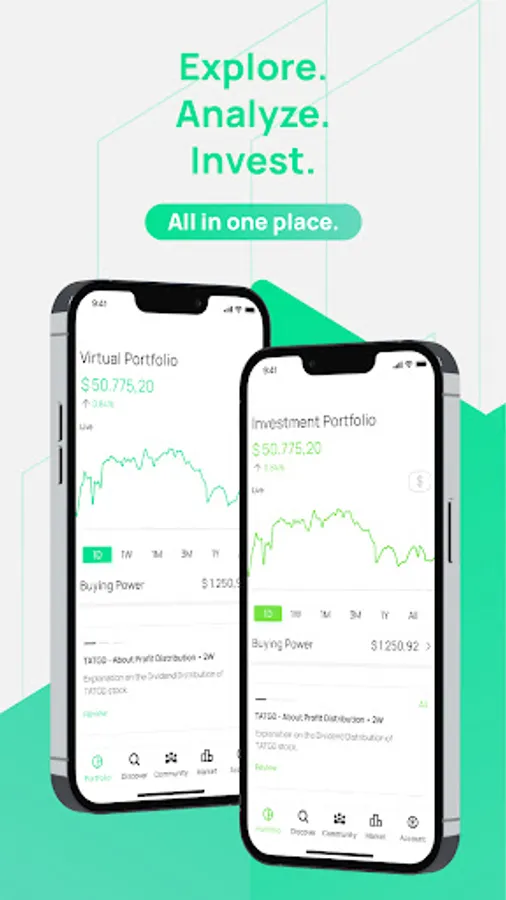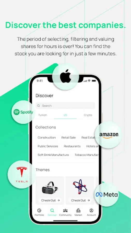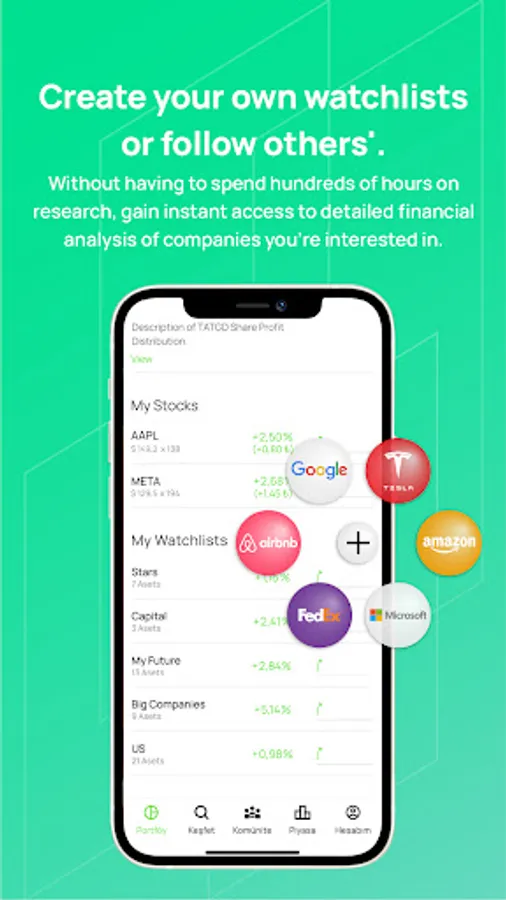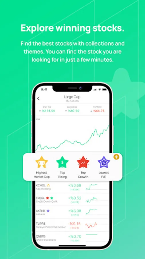 Geliştirilmiş kategorilendirme ve listeler ile artık yeni yatırımını keşfetmek, müzik keşfetmek kadar kolay. Borsanın en karlılarını, en hızlı büyüyenlerini anında bul, en iyi şirketlere yatırım yap. Koleksiyonlar ile yatırım yapmak istediğin sektörü belirle ve sektörünün en iyi şirketlerine yatırım yap.