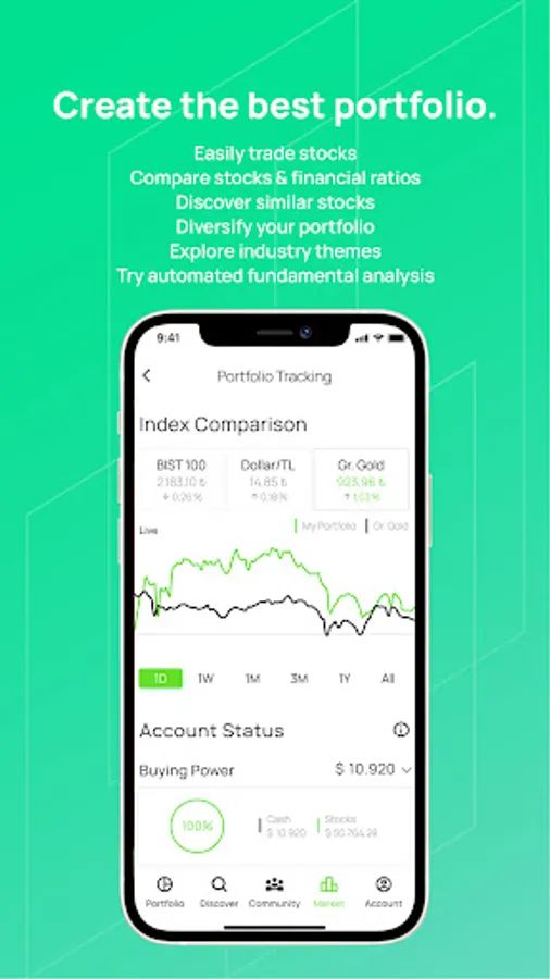 Hisse seçmek ve almak sadece bir dakika! Aldığın hisseleri portföyünde takip edebilir, geliştirilmiş grafikler ile portföyünün günlük, haftalık, aylık hatta 5 yıllık fiyat değişimini bile görebilirsin. Ayrıca, BIST100, dolar/TL, altın gibi endekslerle karşılaştırabilir, yatırım deneyimini en üst düzeyde yaşayabilirsin.