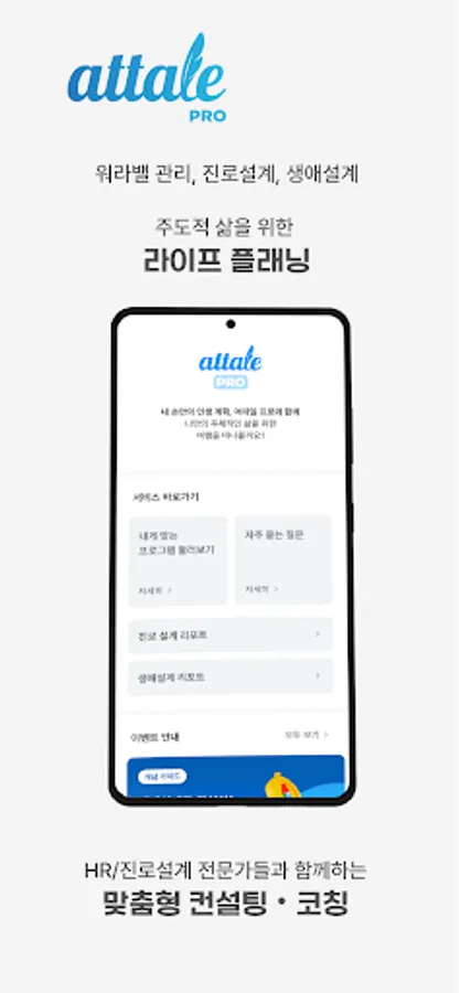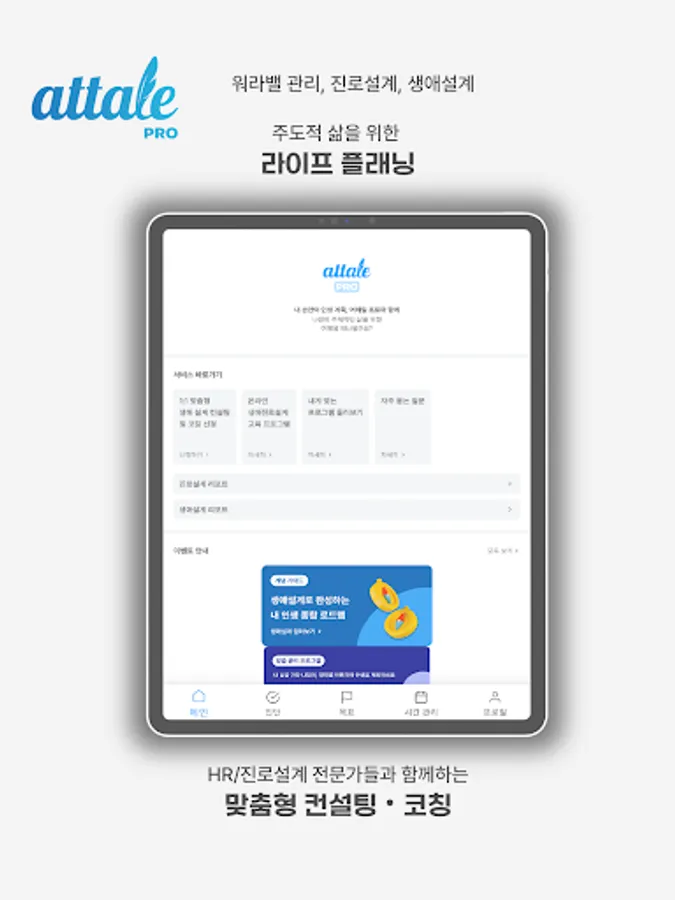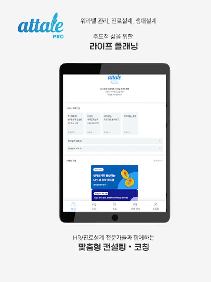 A digital consultant in my hand that fulfills my goals from my daily life data - Starting with life plans such as going to school for youth, employment at university students, work life balance & career & job change, re-employment planning and retirement preparation for retirees, preparation for retirement and retirement life, etc. Even management is possible with Attale Pro!