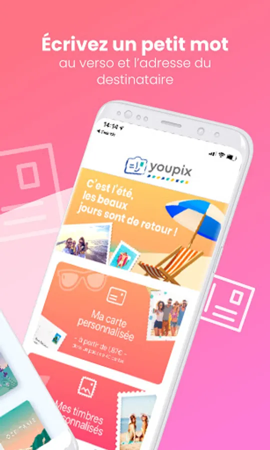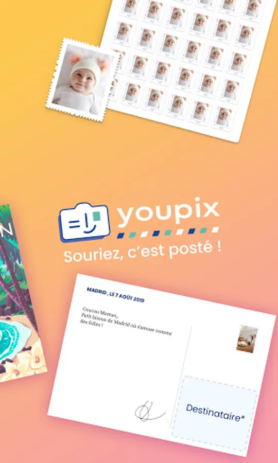 Whatever the occasion: birthday, birth, wedding or family event (announcement), greeting card, holiday postcard, travel postcard or simply telling your loved ones that you love them, surprise them with personalized letters thanks to the Youpix app from La Poste!
