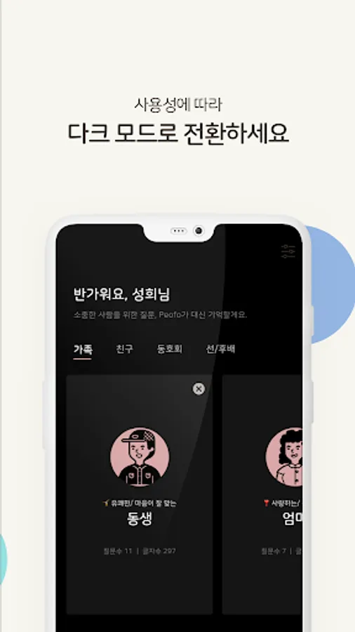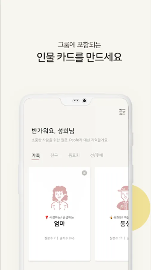 Pipo began with the idea of identifying loved ones around you and getting to know them more so that you can get new inspiration and vitality. Through Peepo, think and record relationships with my precious people who have missed out in busy daily life, such as a supportive family, a pleasant friend, a coworker who communicates well, a mentor that I respect, and a loved one.