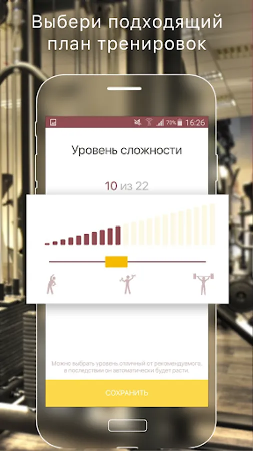 - automatically increases the level of load, depending on the number of successfully completed training.