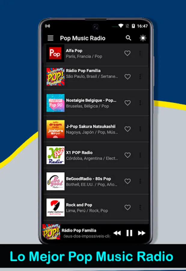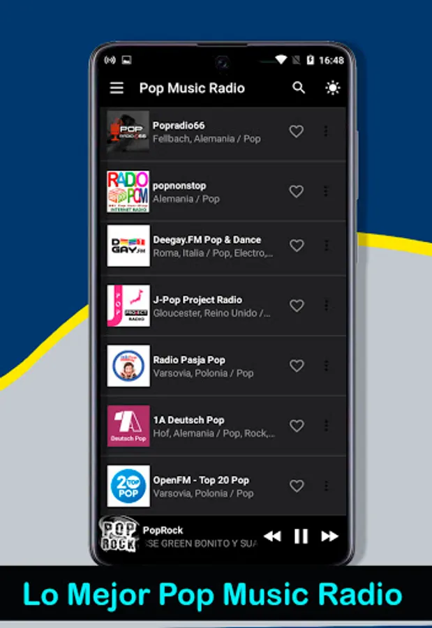 With Pop Music Radio in Spanish, turn your mobile phone into real fun and adrenaline, you can also enjoy the variety of music from all the best representatives of Latin pop music radio live.