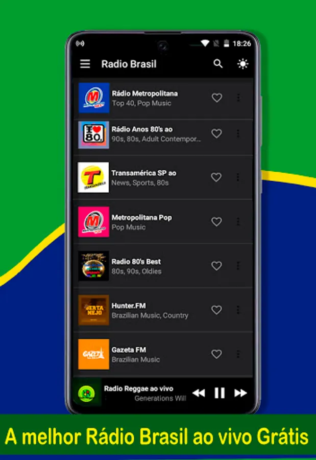 In Radio Brazil AM and FM live you can listen to your artists with their complete discography, see the lyrics of the songs and add them to your Favorite free live Brazilian radios, which will be available every time you want to hear what you are adding very easy, Radio Brasil Online free.