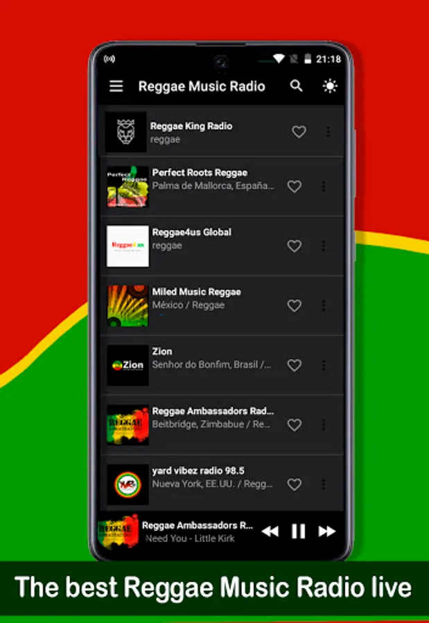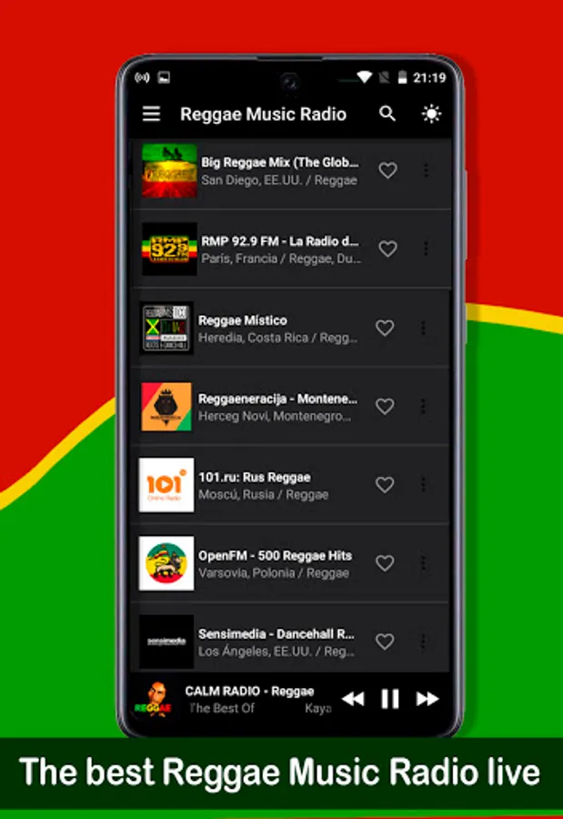 In Reggae Music Radio live you can listen to your artists with their complete discography, see the lyrics of the songs and add them to your personalized Favorite, which will be available every time you want to listen to reggae radio app in Spanish and English, you will enjoy adding very easy , reggae music radio station live