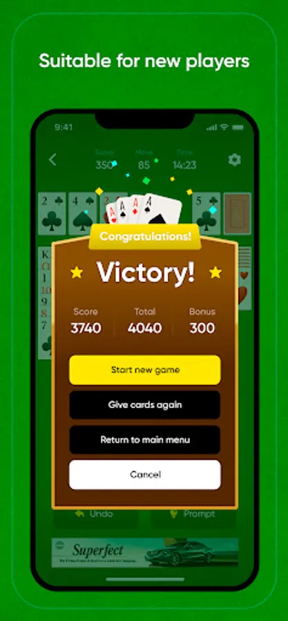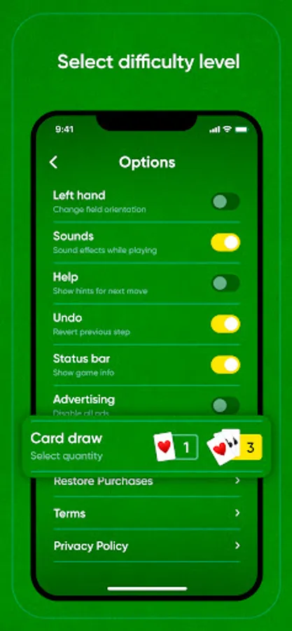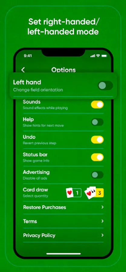 The game app has intuitive and simple controls, one-tap movement of cards, easy dragging of stacks. In the settings, you can choose to play either with your right or your left hand. Set up an easy mode with one card dealing or the more difficult one with three cards dealing. You can pause the game without losing the current progress and resume again later if you need to do something else.