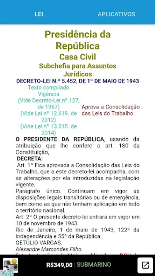 In November 1942, he was presented the draft of the Labor Code, subsequently published in the Official Journal to receive suggestions. After studying the project, Getúlio Vargas appointed the co-authors to examine the suggestions and write the final project finally signed on May 1, 1943, but did not replace the one published in Official Gazette on August 9 of that year.