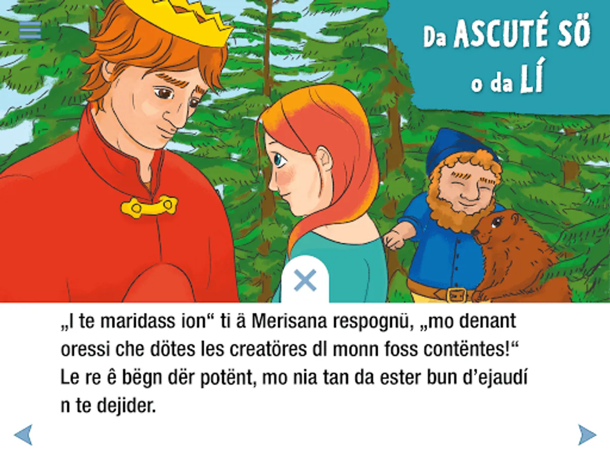 Lascesse trá ite tl monn demorvëia dles munts! Merisana, the bela reina dles anguanes, oress that dötes les creatöres dl monn foss contëntes en le de de süa noza. We fajará mo the king from the great cör por that chësc garetes?