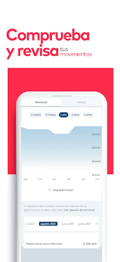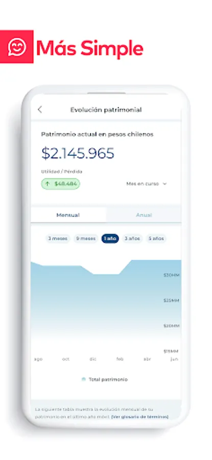 - Review and analyze the evolution of your wealth in multiple formats: products, accounts, type of currency and asset classes.