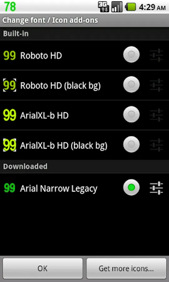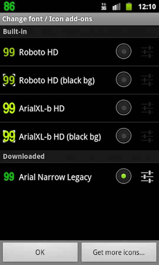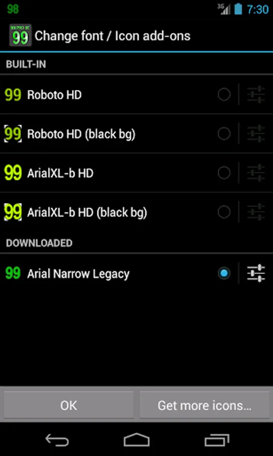 For Android 3.x/4.x users who wish to have the brightest colors possible on their dim status bars, look for our HD add-ons with “b” after the font name. Download HD add-ons within Battery Notifier Pro BT or search for "bnbt" in your browser at Google Play.