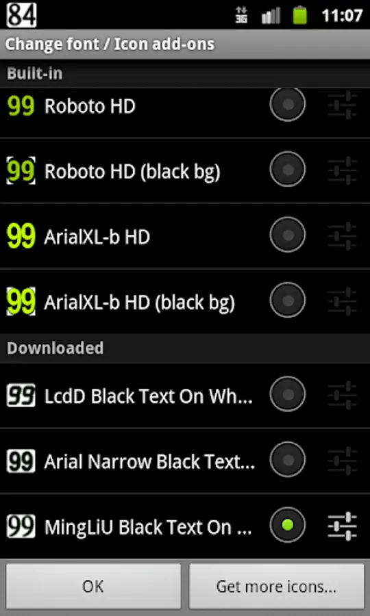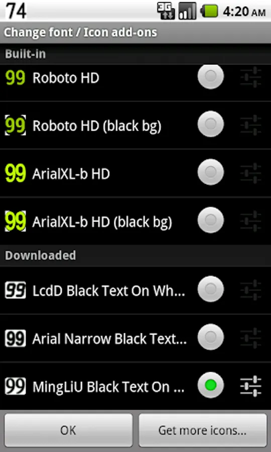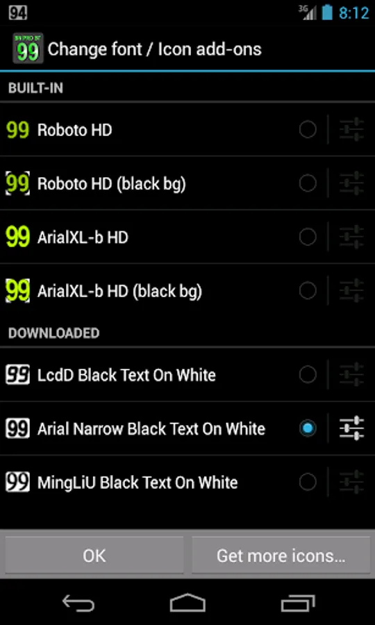 For Android 3.x/4.x users who wish to have the brightest colors possible on their dim status bars, look for our HD add-ons with “b” after the font name. Download HD add-ons within Battery Notifier Pro BT or search for "bnbt" in your browser at Google Play.