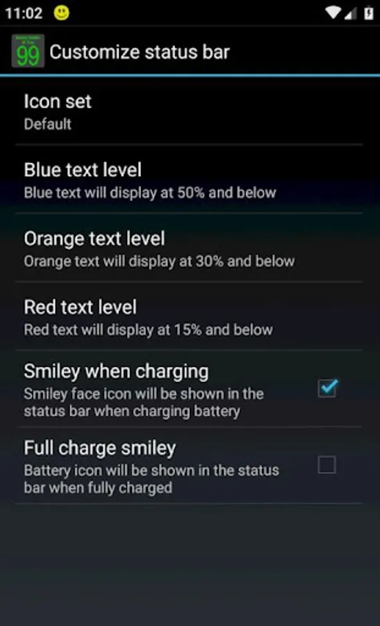 Green, blue, orange and red status bar numbers can be customized to display at the percentages you want. Optional yellow smiley face charging icons. Low & full battery notifications.