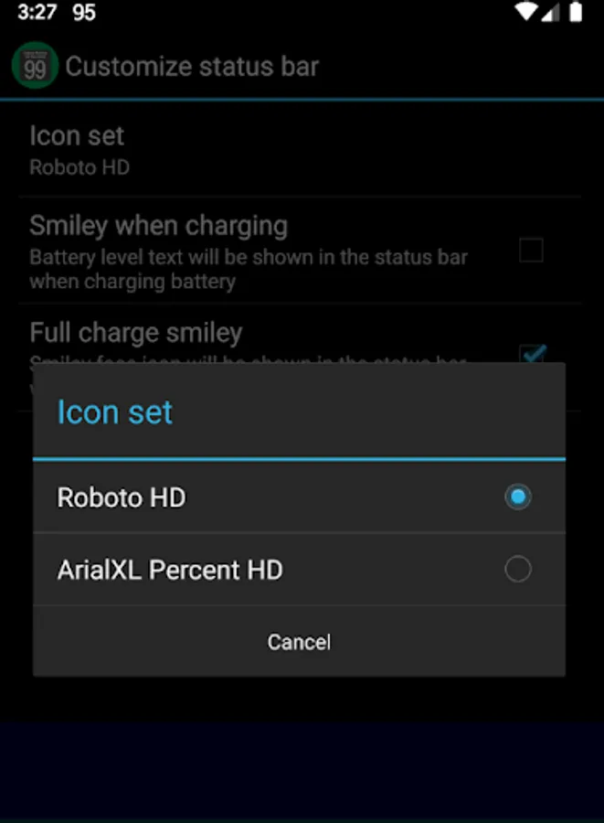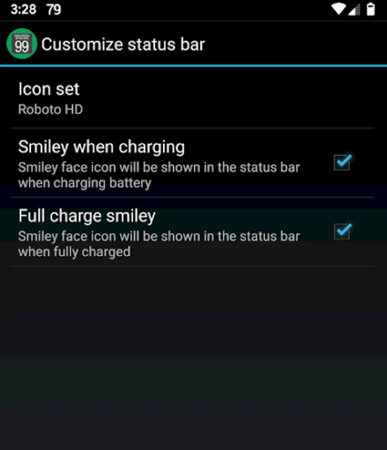 Status bar numbers with or without the percent sign with low and full battery notifications. Optional smiley face charging icons.