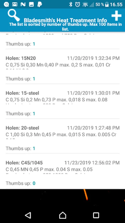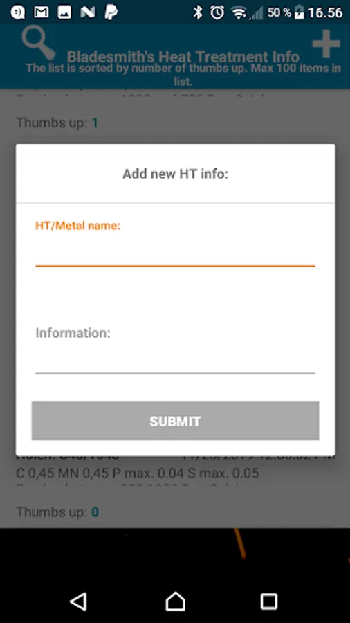 A list of metals and information about hardening and tempering. Users may add new metals to the list, or new information. The users can up vote different information, to push it up on the list. The list will only keep the top 100 items.