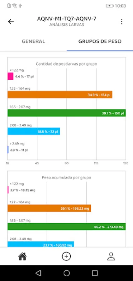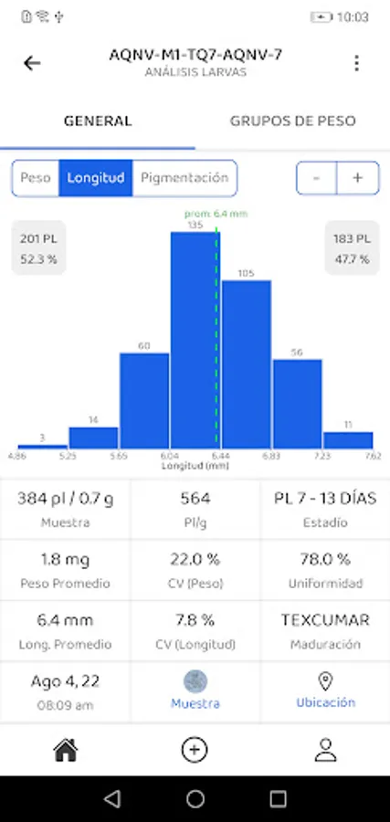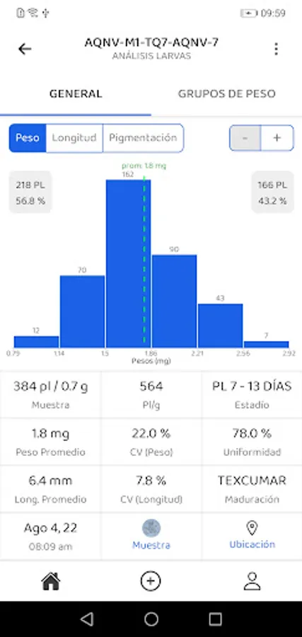 Histogram of weights, sizes, pigmentation, uniformity and coefficient of variation.