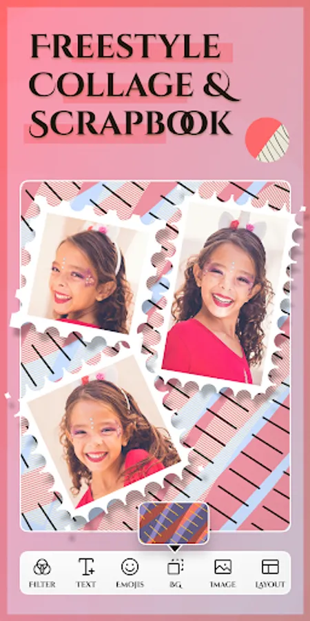 In freestyle photo collage, you can combine number of photos from your camera roll or photo gallery in free style pic collage with photo editor features. You can zoom in/zoom out, rotate or adjust photo, add text on photo collage, add stickers, change the background, and more. It also works as a scrapbook on which you can create a piece of art photo collage by putting together a few images or combine photos.